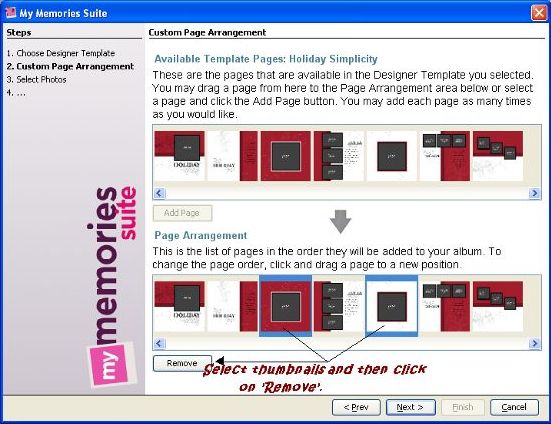 You can now remove, add, and/or place your pages in the order you like. To arrange the pages in a different way, simply drag the thumbnail images of your pages to the place where you want your pages in the ‘Page Arrangement’ bar. If you want to place some more pages, drag the thumbnails you want from the ‘Available Template Pages’ bar to the ‘Page Arrangement’ bar below. If you want to remove some pages, click on the thumbnail on the ‘Page Arrangement’ bar, which you want to remove and then click on ‘Remove’. If you want to remove more then one page, hold your control key in and select those thumbnails and then click on ‘Remove’. I’m going to remove the 3rd and the 5th page and I’m going to add the last page as my third page now.